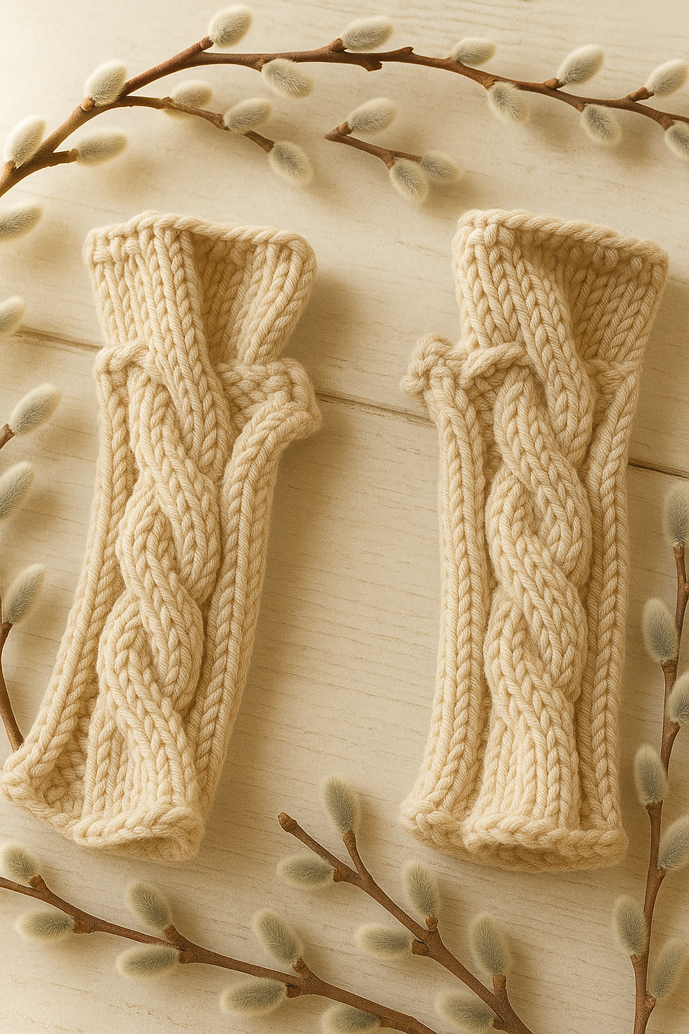 Handgestricktes Winter-Set – Stirnband & Stulpen in Beige mit Zopfmuster |